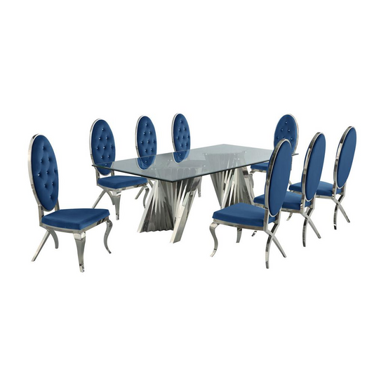 Classic 9pc Dining Set w/Uph Tufted Side Chair, Glass Table w/ Silver Spiral Base, Navy Blue