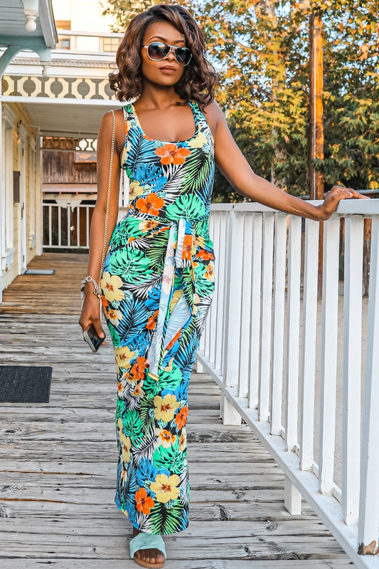 Tropical Print Bodycon Maxi Dress with Front Tie Waist