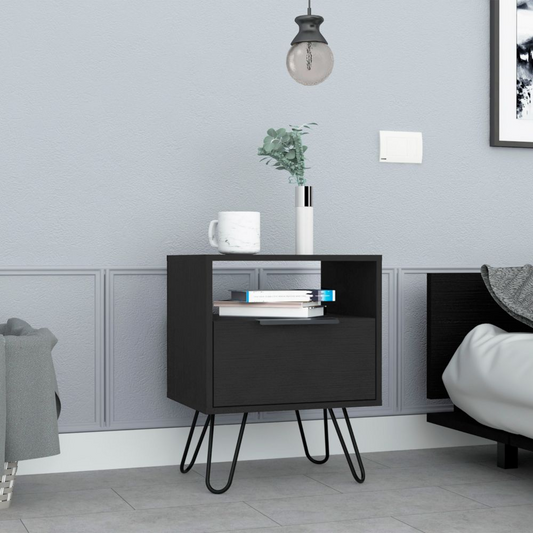 Begonia Nightstand, Two Shelves, Single Door Drawer, Hairpin Legs