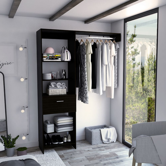 Dynamic Closet System, Five Open Shelves, One Drawer, One Metal Rod
