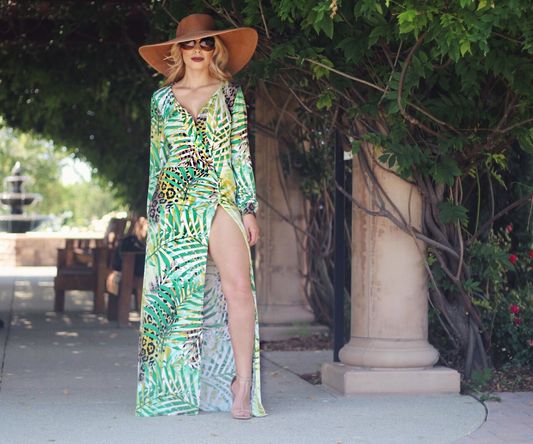 Palm Spring Deep V-Neck Long Sleeves with Side High Slit Maxi Dress