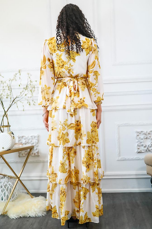 Venechia Print Round Neck Maxi Dress with long closed Bell Sleeves White
