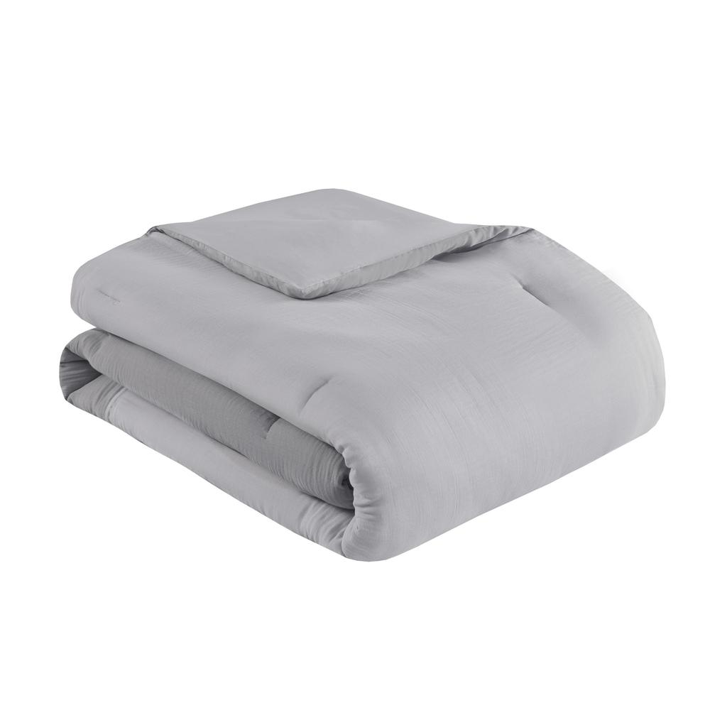 Soft and lightweight, this poly gauze comforter set offers a casual, relaxed style Features a pieced tonal colorblock design Reverses to soft microfiber and oversized for added comfort Set includes comforter and 2 shams Hypoallergenic polyester filling in the comforter (filling contains no allergens and is treated to be dustproof) Machine washable and steam iron for wrinkle removal Items in this set may come in rolled or compressed packaging and will need to be fluffed up