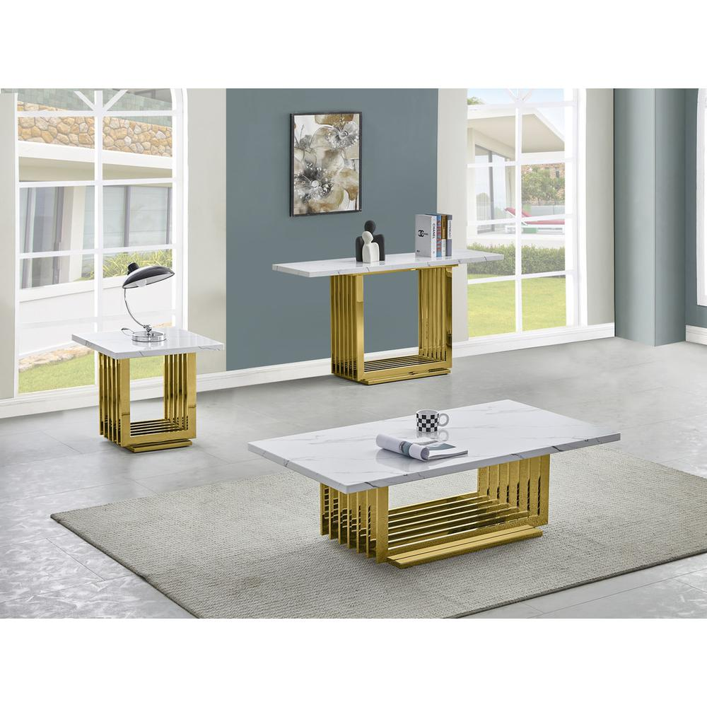 Glam style four piece set in white and gold. This set comes with one coffee table, one end table, and one console table. All the pieces of this set feature a real white marble top and a gold color stainless steel base with a polished finish. Do note the marble top may not all be of the same pattern due natrual circumstances. Assembly is required.