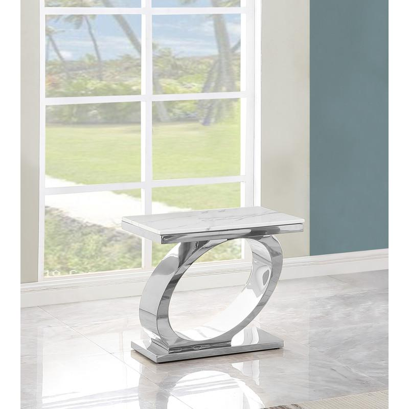 Best Quality Furniture’s stunning coffee table collection with a coffee table, two end tables, and console table. This collection features a white marble top and stainless steel base with a polished finish. The ovular angled base design makes this collection unique and interesting, perfect for those looking to upgrade their living space.