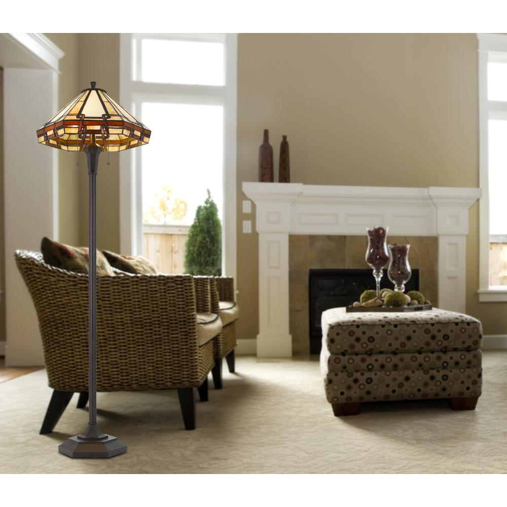 Tiffany shade Art color glass Dual pull chain switches Mission Style Geometric pattern Matching table lamp Matching finial Heavy weighted base