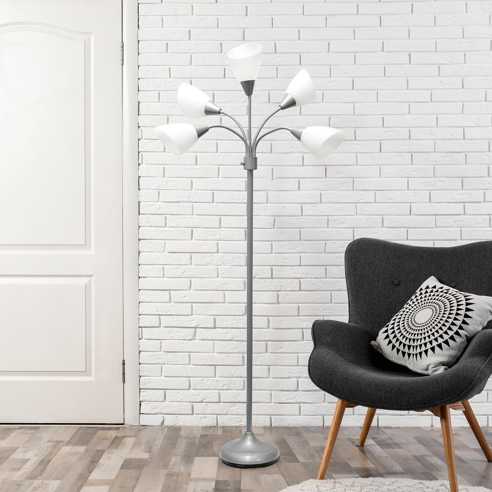 What a fun and trendy floor lamp this is! With a tall sturdy base below 5 flexible goosenecks extending to a plastic sloping shade, this metal lamp is ideal for environments requiring different directions of light as needed. The extensions are easy to maneuver to provide light up, down, sideways, etc. without having to move your lamp from its location. Check out all of the available base finish/shade color options available to suit your needs.