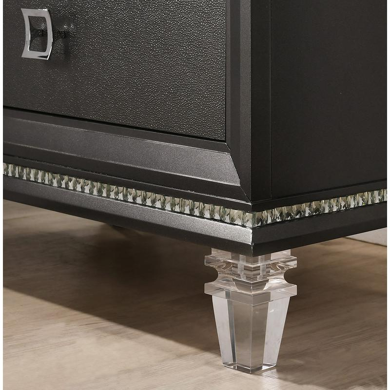 This bed room set comes with: 1 Platform Bed, 2 Night Stands, 1 Chest, 1 Dresser, and 1 Mirror. The bed has tufted buttons, and 2 drawers and acrylic legs. The whole bed set has acrylic legs and square knobs. This bedroom set is perfect for a simplistic look.