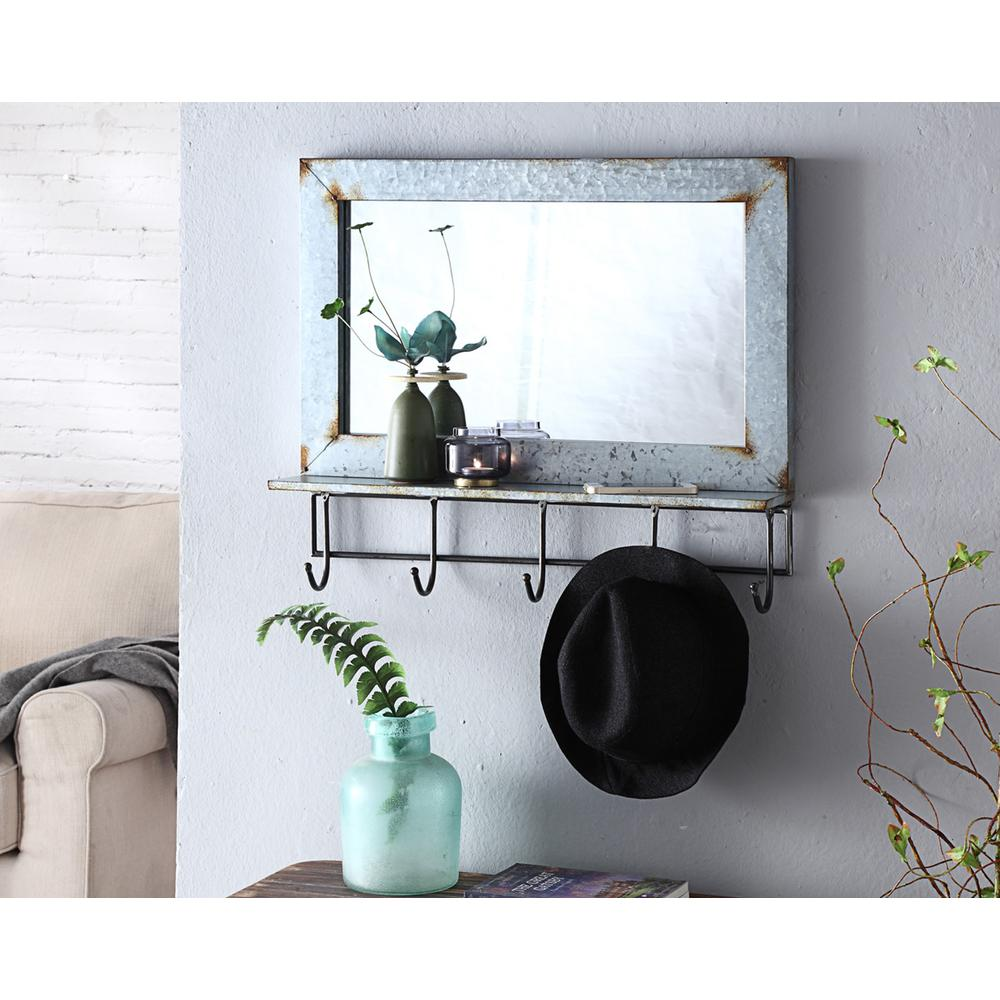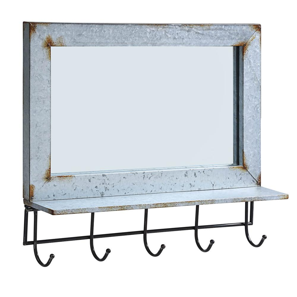 The Abbey Mirror is a great piece that will brighten up your entry way, living room, bathroom, or any space needing a touch of timeless décor. The rustic metal framed mirror has 5 hooks at the bottom to hand coats, towels, etc. and 1 small shelf for additional storage. The rugged look of this mirror is suitable for various types of styles. Clean with dry nonabrasive cloth.