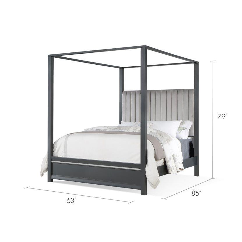 This luxurious canopy design adds a modern silhouette to any bedroom. The headboard features a sizable, vertical channeled headboard that is upholstered in velvet fabric. The dark grey square frame is built from solid and manufactured wood combined with slats and support legs. (Mattress and Box Spring required)
