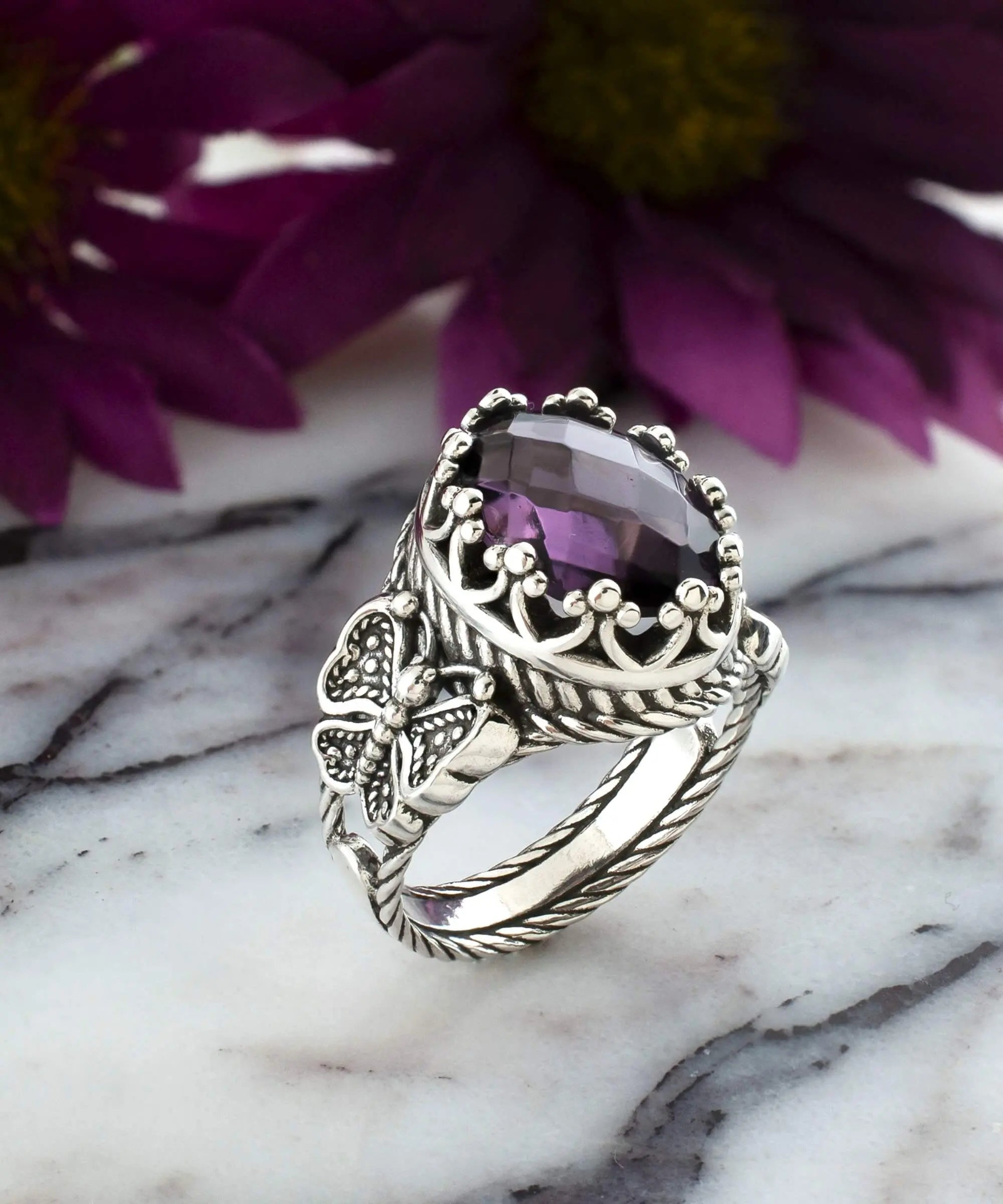 Amethyst Gemstone Filigree Art Double Butterfly Detailed Women Silver Statement Ring
