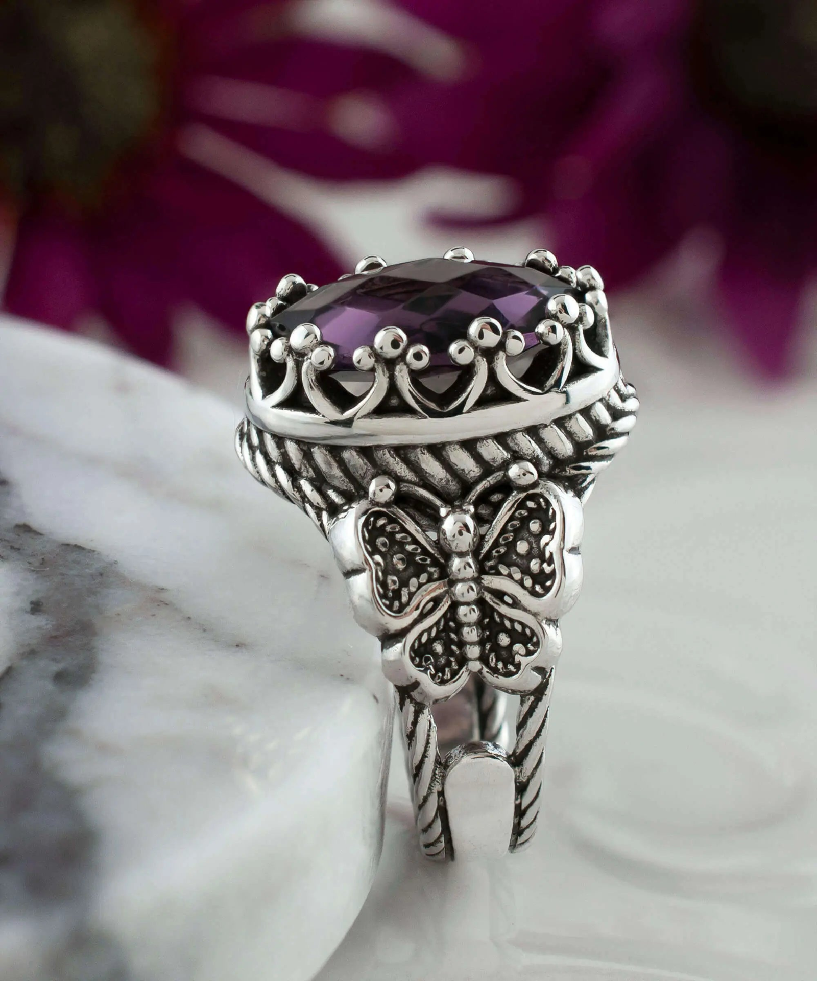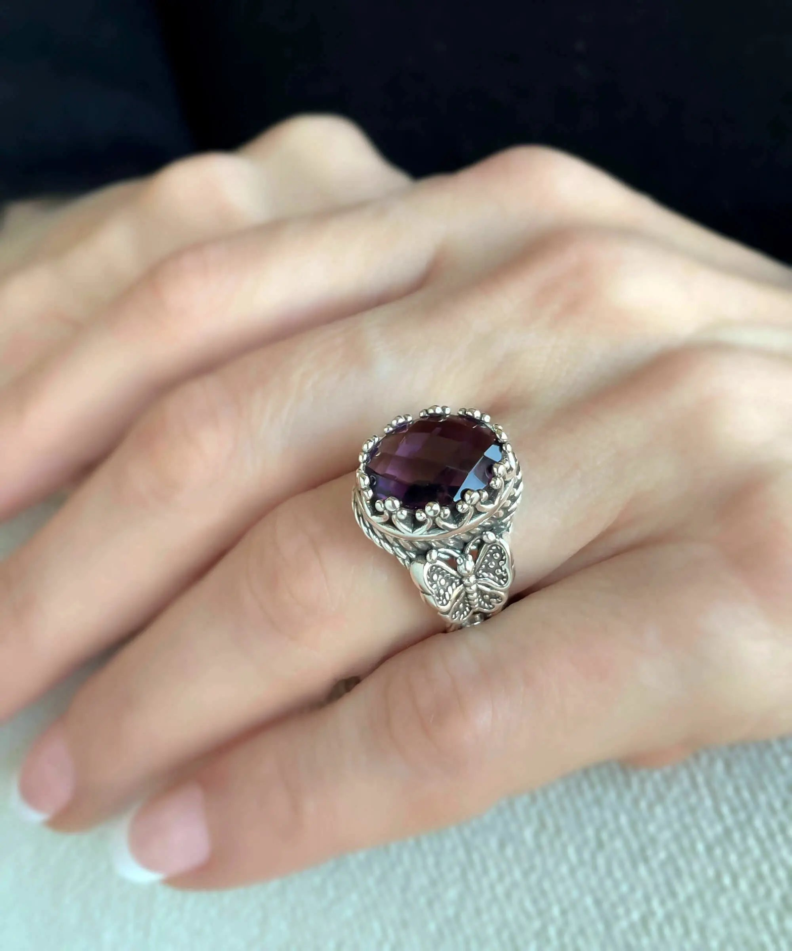 The deep purple color of the amethyst gemstone and the exquisite butterfly detailing make this ring a truly unique and special piece. It is available in sizes ranging from 5 to 12.5, making it suitable for various finger sizes.