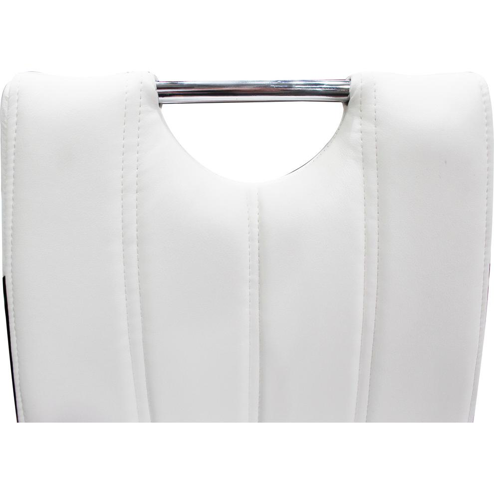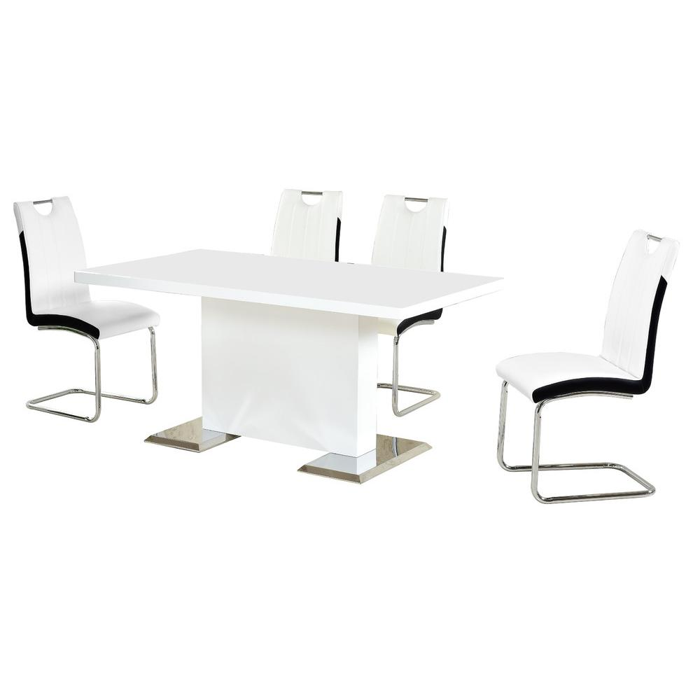 Finish: White (Glossy Finish), White with Black Trimming (Chairs) Material: Poplar Wood, Engineered Wood, Lacquer, Stainless Steel, Faux Leather, Chrome Includes One (1) table and Four (4) chairs Assembly is required Table : White lacquer finish with chrome base Chairs : Faux leather upholstery with chrome base
