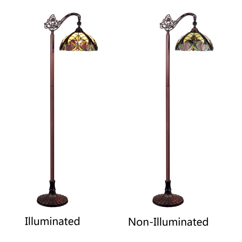 Adia is a beautiful, stained glass reading floor lamp in a traditional Victorian style, featuring a detailed base and a foot switch. This lamp would be perfect in a bedroom, living room, and dining room. The shade is hand-crafted, using the same methods developed by Louis Comfort Tiffany in the early 1900's. This process entails using 168 hand-cut stained art glass pieces and 20 glass beads, each wrapped in fine copper foil and soldered together at extremely high temperatures to form each unique piece. Exact size to the nearest inch may vary, and exact color of each glass piece may vary due to each piece being hand crafted. First image is with the light shining through, second image is with no light. Dry listed and recommended for an indoor setting.