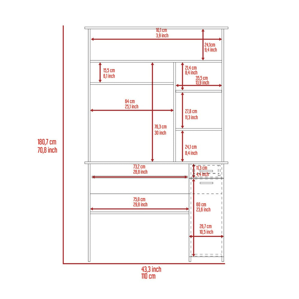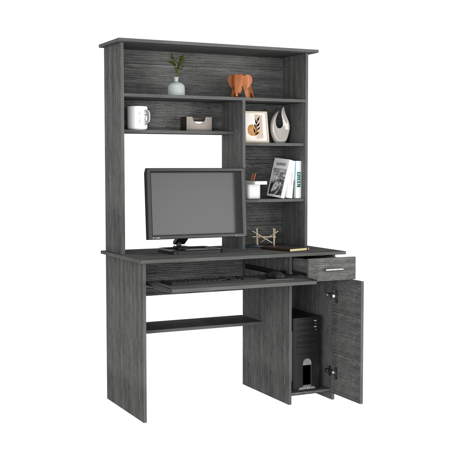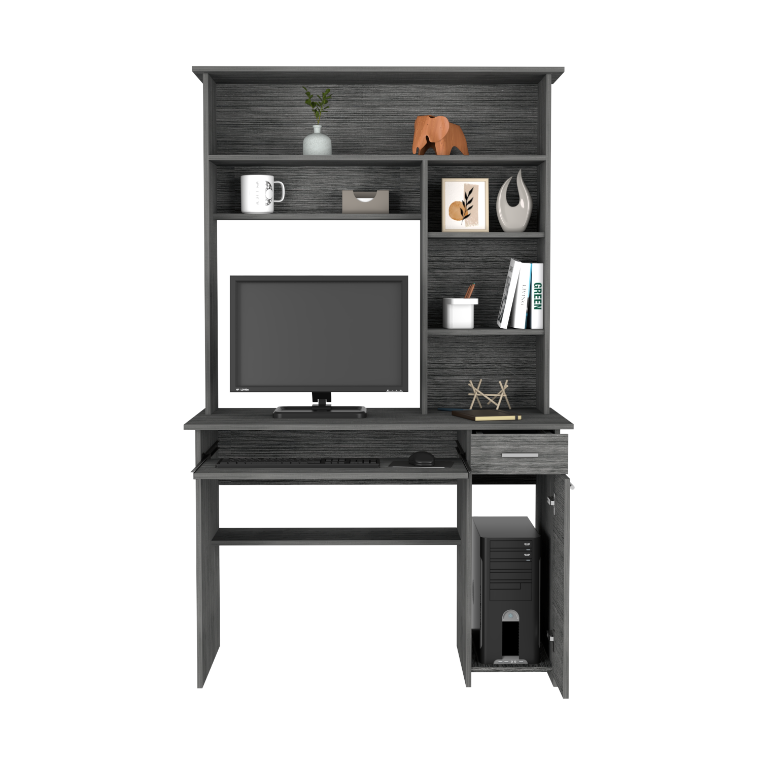 This sturdy hutch desk is 71” tall and provides multi-level storage and organizational options. CPU tower storage is neatly tucked below with an access area behind. A retractable keyboard tray tucks away below the desktop to create less clutter and protect your keyboard. Multiple shelves for storage and décor make this desk very versatile. Designed with an elegant smokey oak manufactured wood finish.