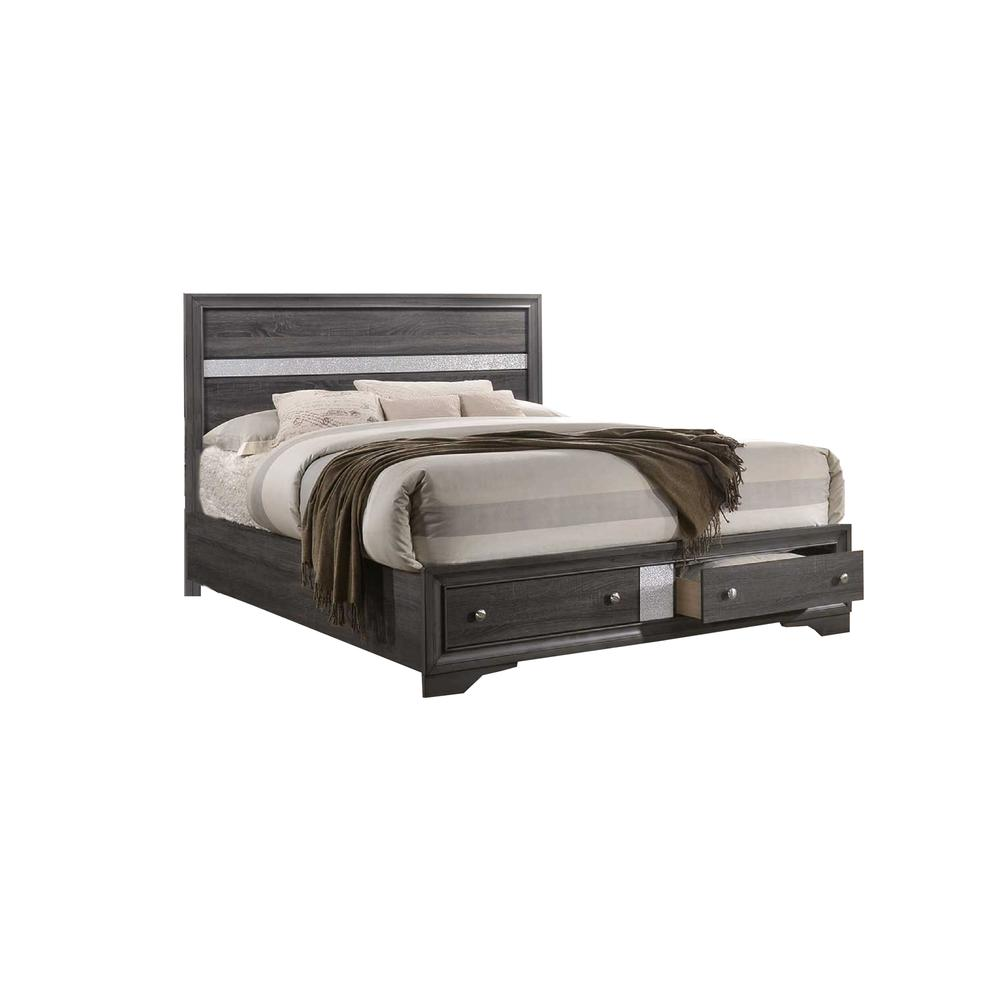 This David 6-Piece Bed Set includes: Queen Bed; 2 Nightstands; Dresser; Dresser Mirror; Chest. Bed frame options available in Eastern King, California King, and Queen. The clearance from floor to underside of bed is 4". David Bed Set features silver strip accent for all of its pieces. Footboard features 2 drawers with roomy storage for clothes. This is a platform bed, so you won't need a boxspring. Other collections of David Bedroom Sets are also available to choose.