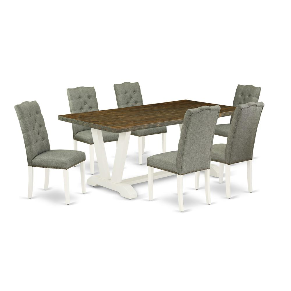 East West Furniture V077EL207-7 7-Piece Kitchen Dining Set- 6 Dining Room Chairs with Smoke Linen Fabric Seat and Button Tufted Chair Back - Rectangular Table Top & Wooden Legs - Distressed Jacobean a