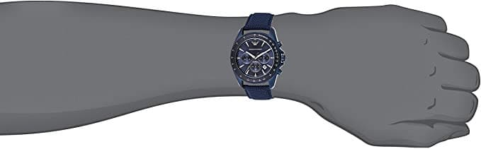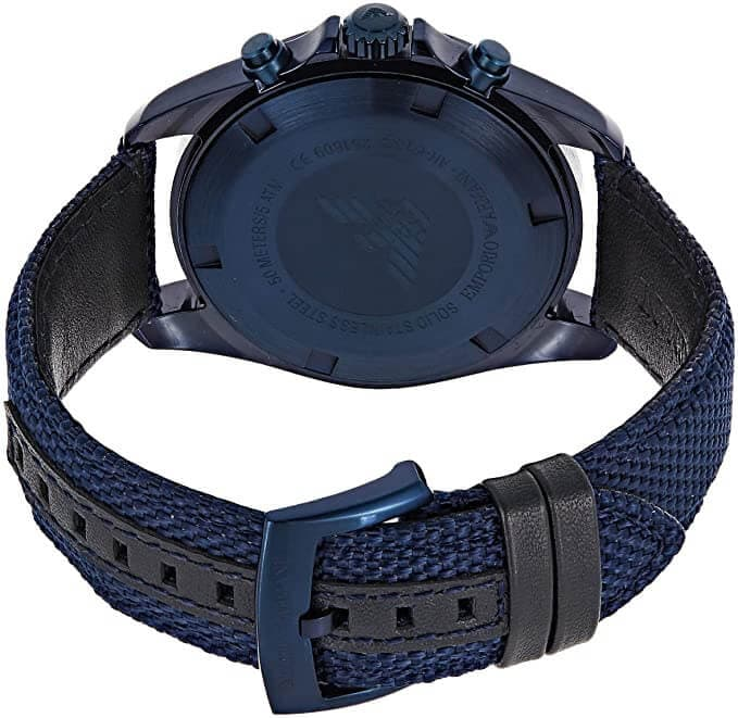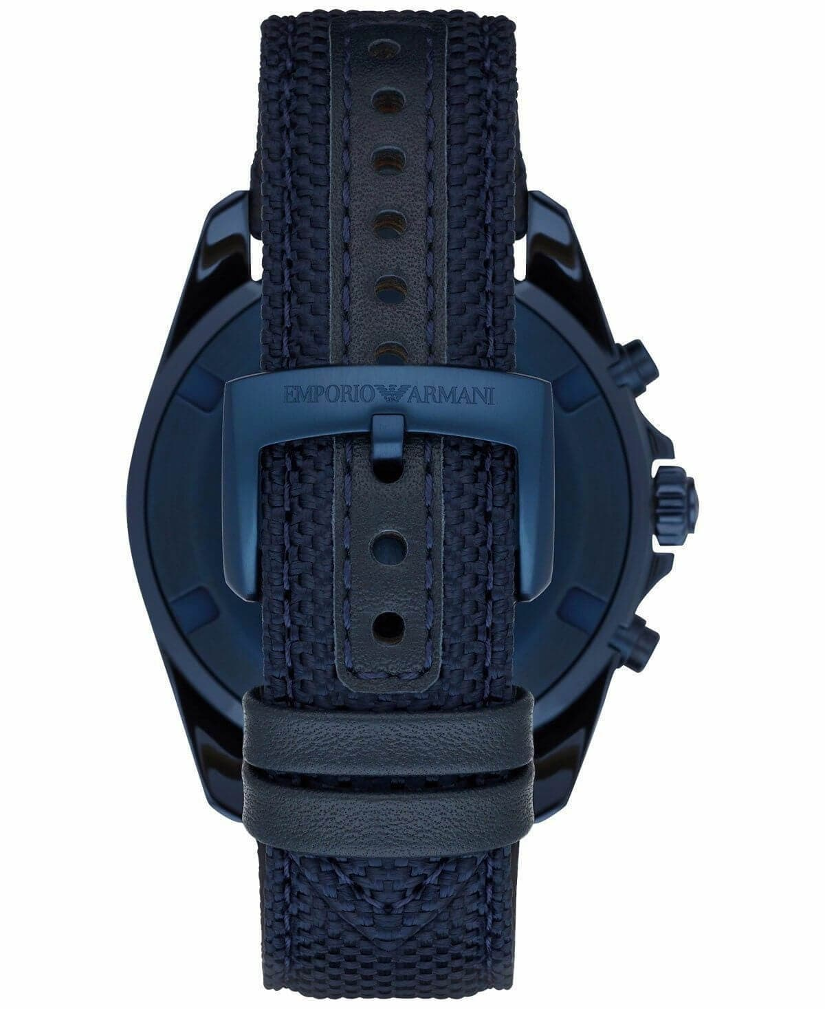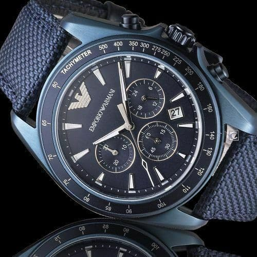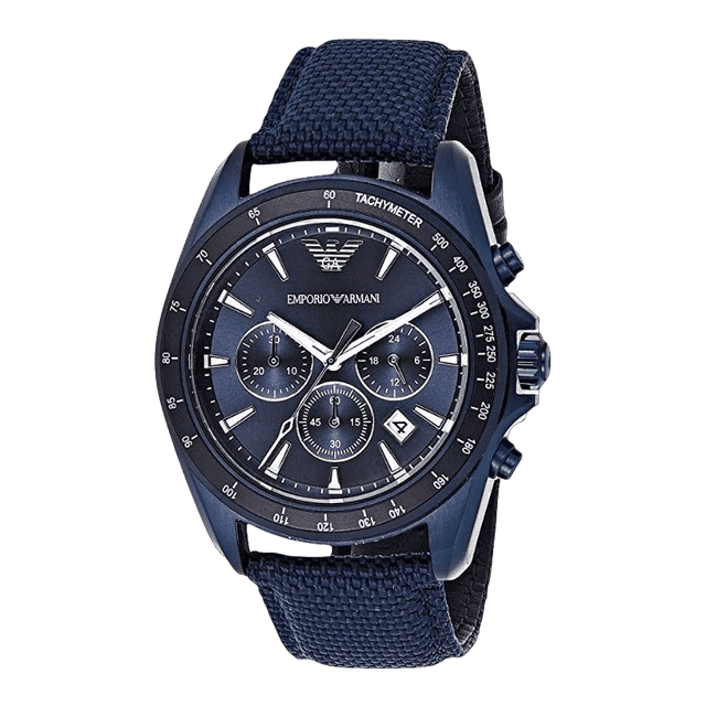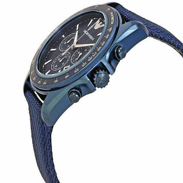 This dynamic blue IP men's Emporio Armani watch features an aluminum tachymeter top ring and blue sunray chronograph dial accented with silver-tone indexes, a date window and three sub-dials. A leather-backed blue Cordura tactical nylon strap completes the look.