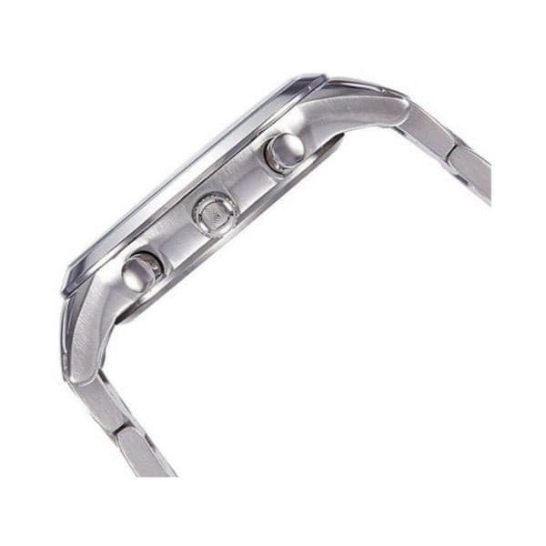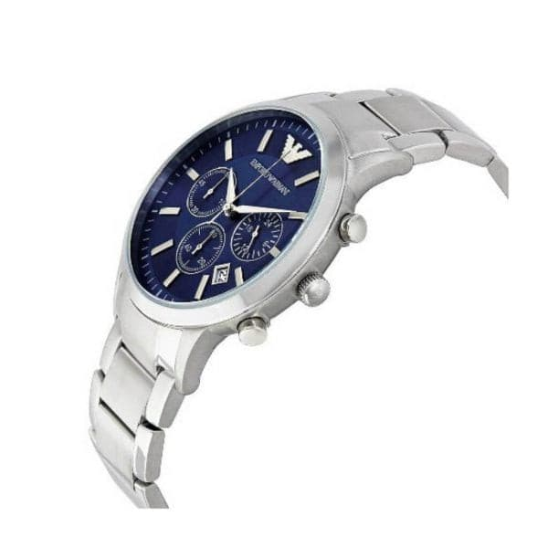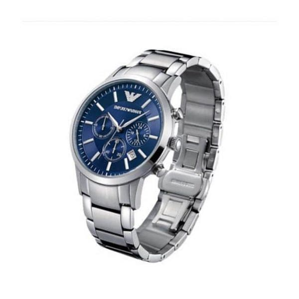 - Silver-tone watch featuring blue sunray dial with logo, date window, and three chronograph subdials