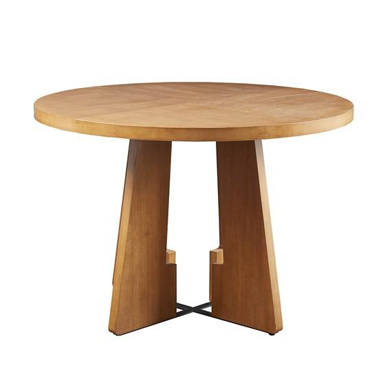 Redefine your dining space with the simple, modern style of the INK+IVY Kennedy 44" Diameter Round Dining Table. Finished in beautiful pecan wood veneer, this round dining table features a natural wood grain flipped in different directions on the table top to create an eye-catching pattern. An open X-base design provides sturdy support, while also adding to the visual appeal of the contemporary design. Measuring 44" in diameter, this modern dining table comfortably seats 4 people and adds a warm and inviting update to your dining room. Base assembly is required and tools are included.