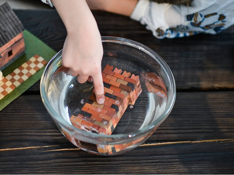 Small real-looking bricks and tiles are easily and firmly connected with safe non-toxic glue.