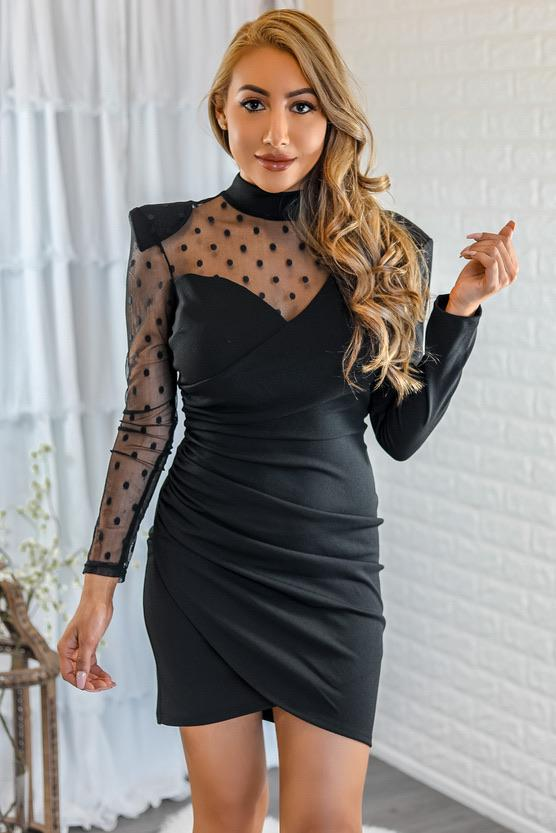 ASYMMETRIC DRAPED SWISS DOT DRESS SOLID & MESH COMBO W/SHOULDER PAD.
