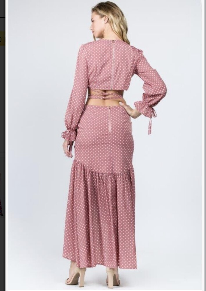 Introducing our Scarlet Polka Dot Top and Skirt Set in a charming Dusty Pink hue, a delightful ensemble that effortlessly blends style and comfort. The polka dot pattern adds a playful touch, while the ruffle sleeves and skirt detail enhance the overall feminine appeal. The set is designed with a convenient back zipper for easy wear, ensuring a seamless and elegant look. Crafted for versatility and chic sophistication, this ensemble is perfect for various occasions. The Scarlet Set is completed with a flattering fit that runs true to size, and our model showcases it in a small, allowing you to confidently express your style with grace and confidence. Elevate your wardrobe with this timeless and trendy Polka Dot Top and Skirt Set, a must-have for any fashion-forward individual.