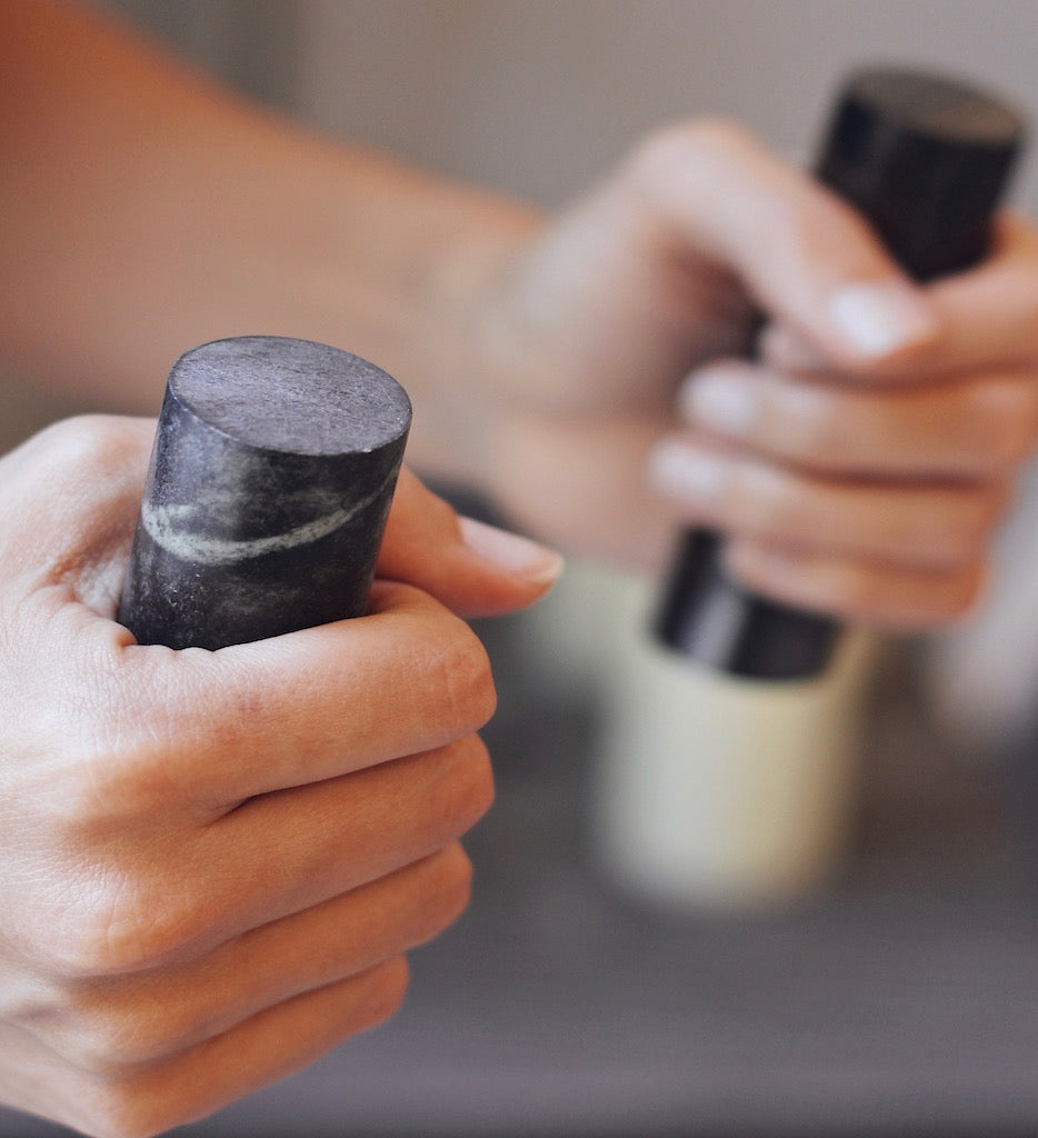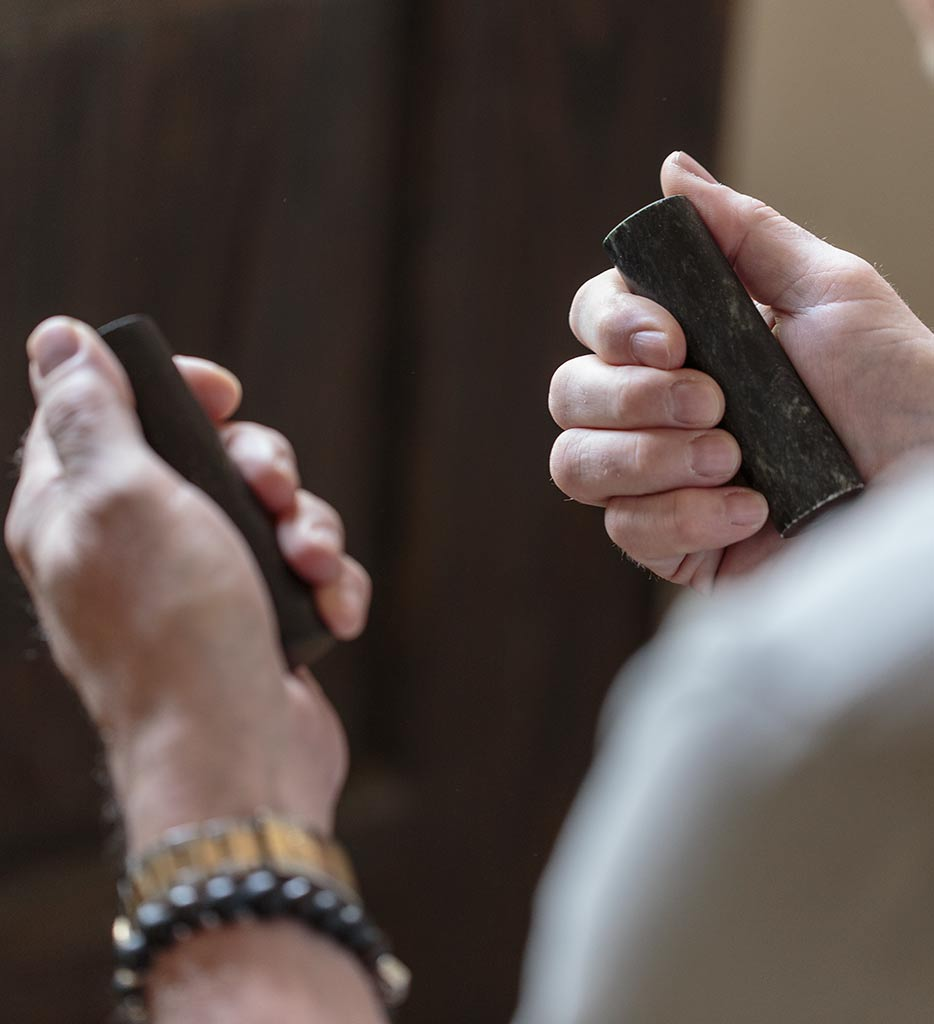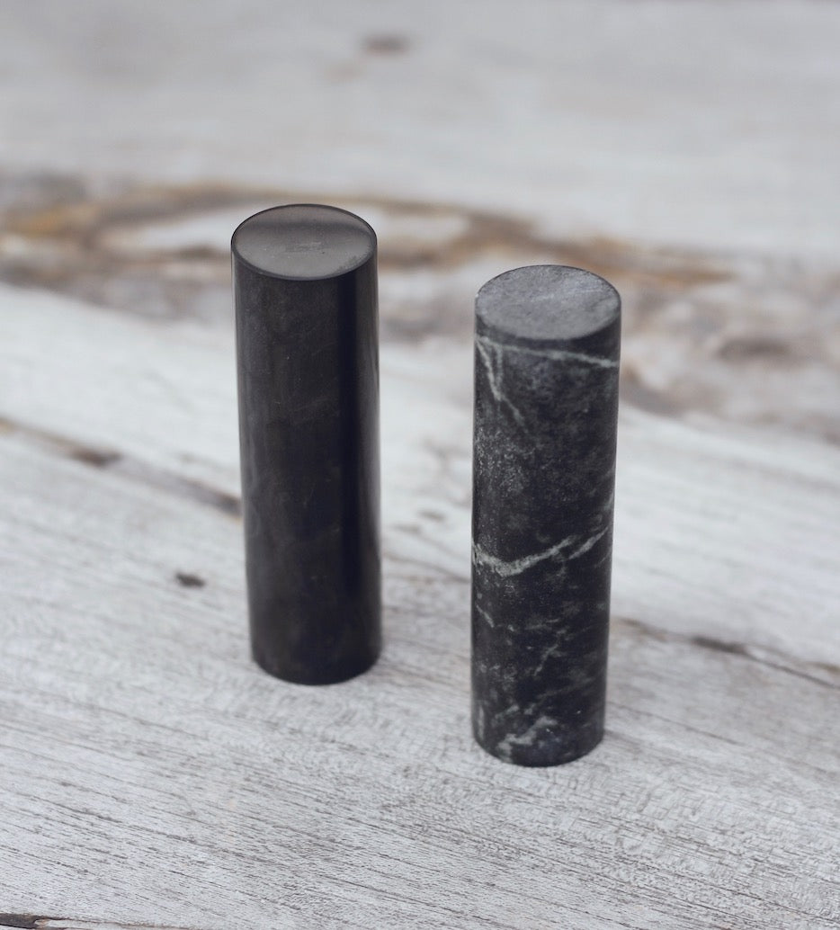- hold the darker SHUNGITE cylinder (Yin) in your left hand