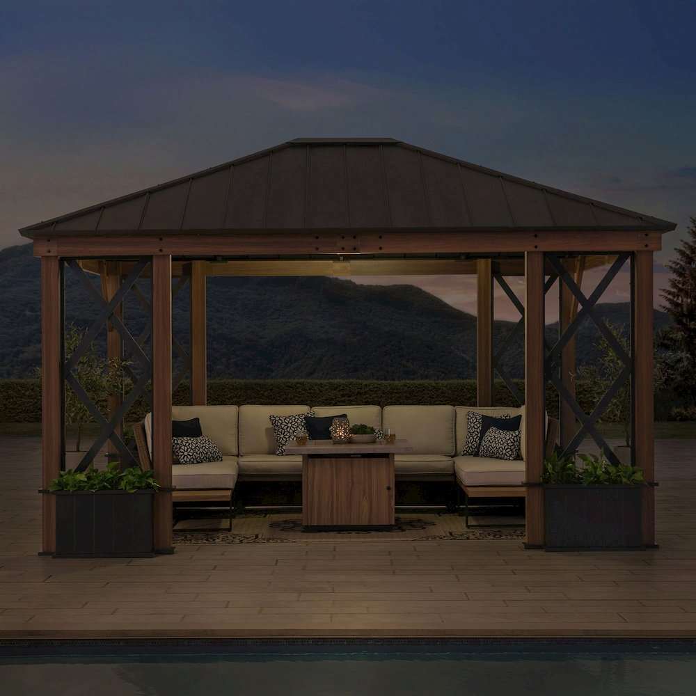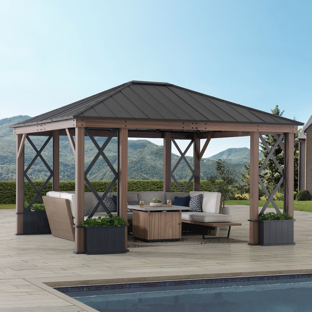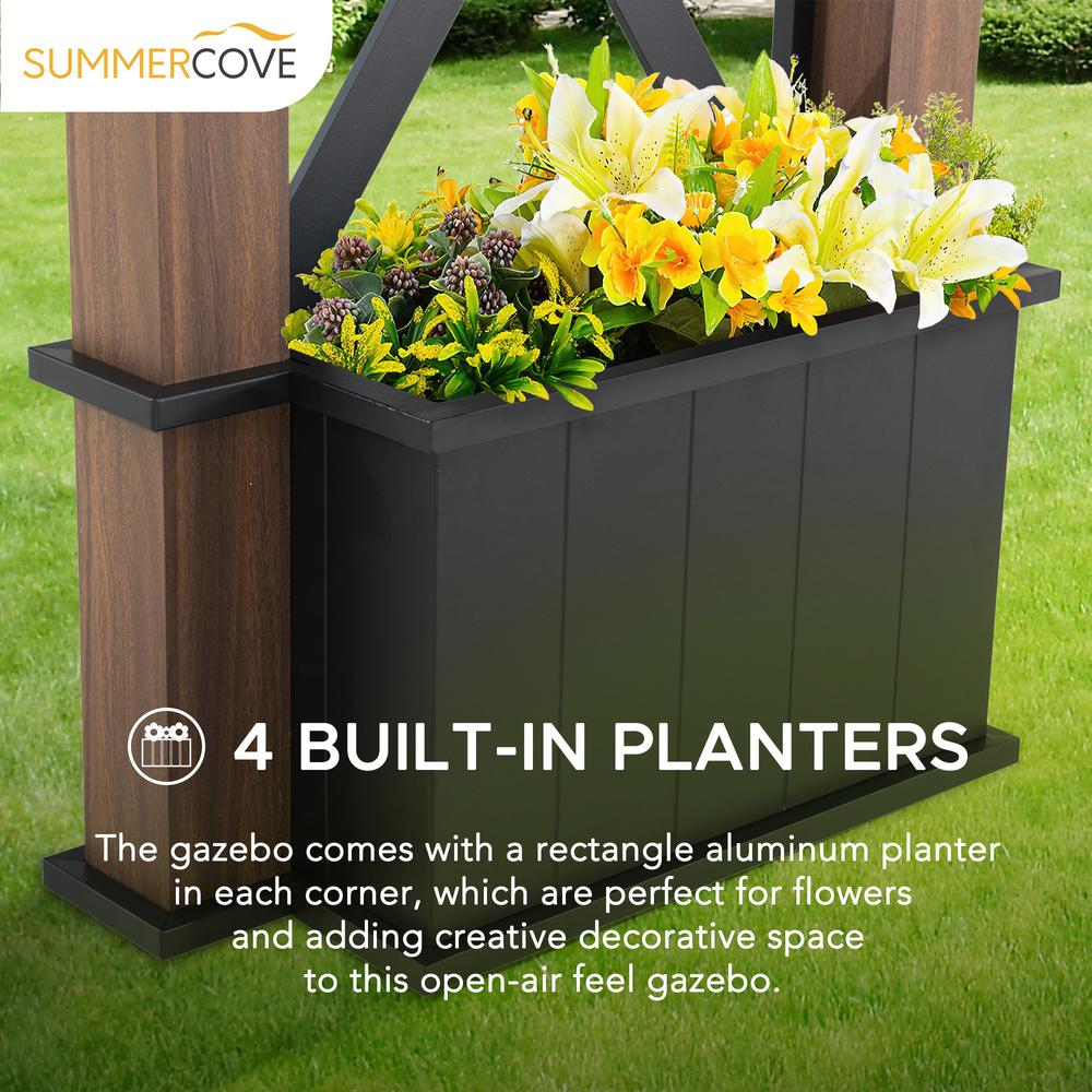 Expand your living space by bringing the indoors outside and create an end-of-the-day oasis that’s the perfect spot for entertaining family and friends. Create the perfect outdoor setting for any time of the year. Spend all four seasons enjoying a covered spot outdoors under the natural wood-looking hardtop gazebo made of rust-proof aluminum frame and galvanized steel roof. The four built-in aluminum planters are the perfect place to add greenery or florals during warmer months for color. Use them to hold dried corn stalks or wheat bundles for some autumnal decor. Set the mood by suspending a chandelier from the incorporated ceiling hook for additional functional light and high design. With straightforward, easy-to-follow assembly instructions you’ll soon be relaxing in your favorite new outdoor living space, and for years to come