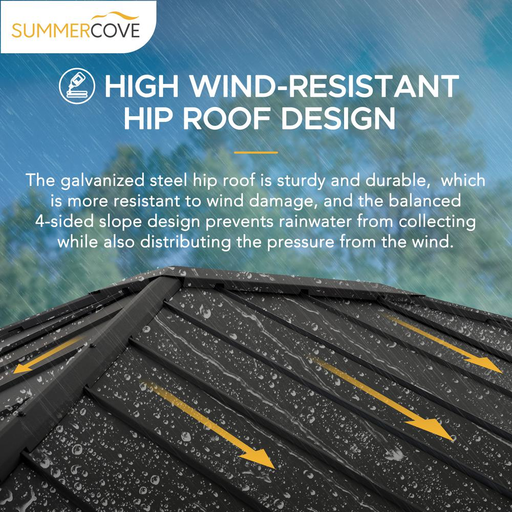 Rust-resistant Aluminum Frame: With a rust-resistant aluminum frame and galvanized steel roof, this hardtop gazebo is durable and sturdy. These posts feature a natural wood grain finish to add cozy style to your outdoor conversation area Light Up Your Outdoor Patio:This metal gazebo is provided with a ceiling hook for suspending lighting (not included) to illuminate your outdoor evening gatherings Customizable & Stylish Design: This outdoor gazebo comes with 4 built-in aluminum rectangle shaped planters for growing flowers, while making the structure of the gazebo steadier and sturdier Upgrade Your Outdoor Living Space: Size: 158.4 in. L x 132.1 in. W x 116.9 in. H, Weight: 535.72 Pounds. This beautiful hardtop gazebo is a perfect addition to various outdoor living spaces, such as patios, decks, backyards, gardens, swimming pools Easy to Assemble: Comes with illustrated assembly instructions and is backed by an experienced customer service team ready to answer any questions that may arise 4 Built-in Planters: The gazebo comes with a rectangle aluminum planter in each corner, which are perfect for flowers and adding creative decorative space to this open-air feel gazebo. Plus, it makes the structure of the gazebo steadier and sturdier Rust-proof Aluminum Frame: Made of durable rust-resistant aluminum frame that provide ample structural strength, while the beautiful natural wood grain appearance finish makes this gazebo a gorgeous addition to your garden and patio Sturdy and Stable Construction Eight 4.6 x 4.6 inch strong posts with ground stakes secure the gazebo to the ground to resist heavy wind, making this gazebo extremely durable, stable, and can be used for many years