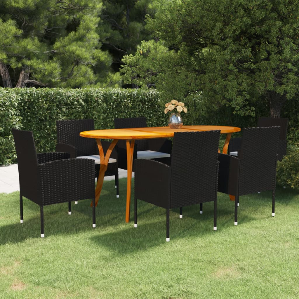 This outdoor table is made of solid acacia wood, making it sturdy and stable. The oil-finished surface also makes the table easy to clean with a damp cloth. Additionally, the curved legs contribute to its stylish design. Featuring a steel frame covered with weather-resistant PE rattan, these dining chairs are sturdy and easy to clean. The thickly padded cushions add comfort in your lounging time.