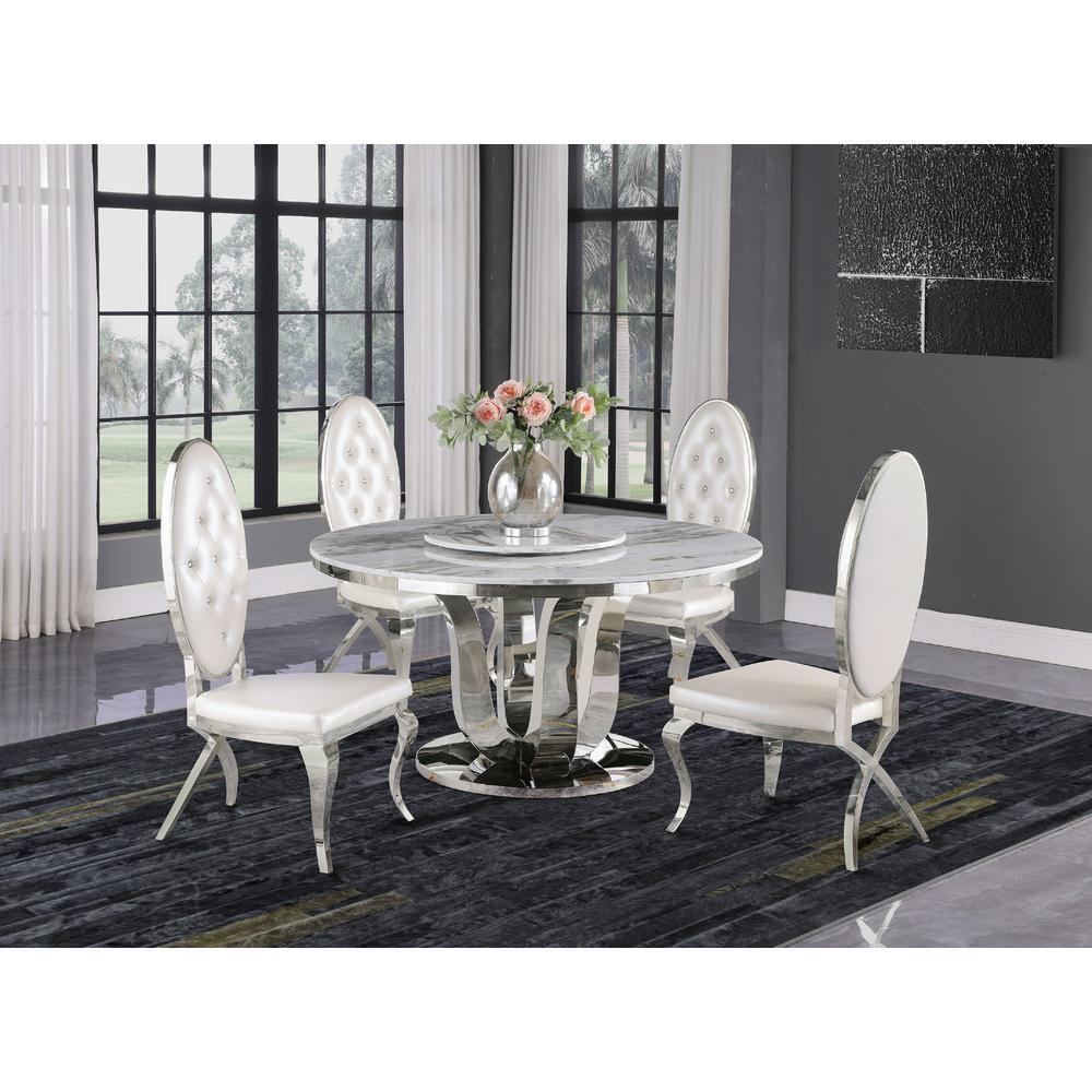 White Marble Lazy-Susan Dining Set Tufted Faux Crystal Chairs in White Faux Leather